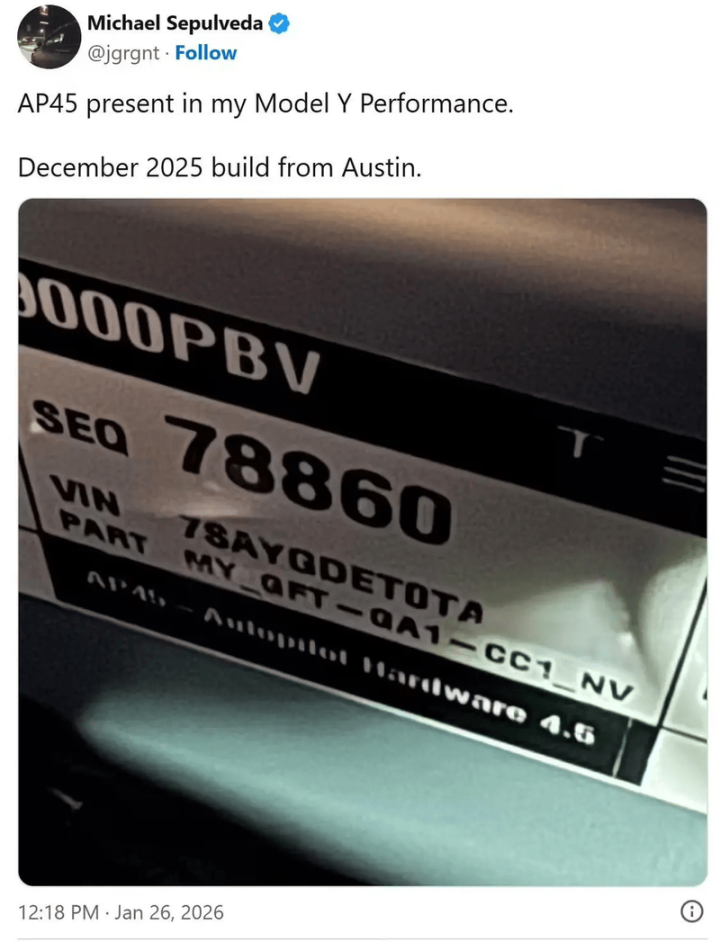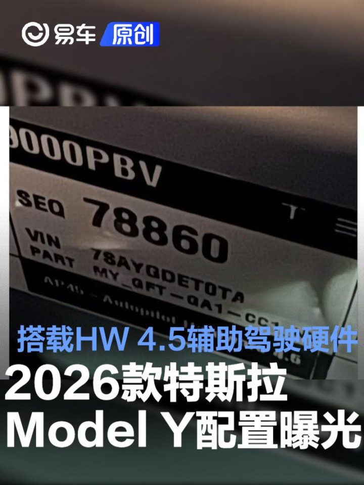 易车讯据媒体报道称,2026款ModelY汽车搭载了HW4.5辅助驾驶硬件。新车手套箱下方拥有型号为“AP45”的辅助驾驶计算机,零件编号“2261336-02-A”。