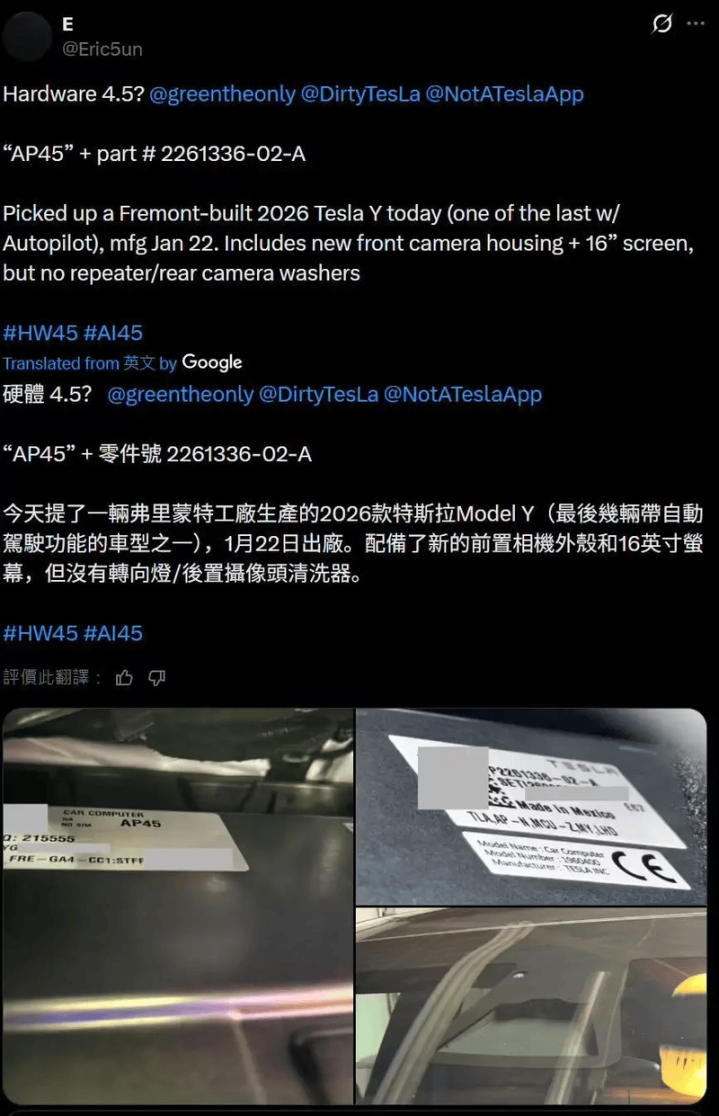 值得注意的是,此前曝光的特斯拉电子零件目录同样出现了HW4.5的线索,其目录列出了“CARCOMPUTER–LEFTHANDDRIVE–PROVISIONED–HARDWARE4.5”部件,零件编号“2261336-S2-A”,售价2300美元。