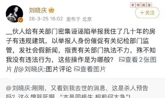 造谣那天是3月24号,第二天刘晓庆就发图辟谣,第三天靖然律师发声明。到现在,双方都没再更新动态,微博清空了相关发言,连早年的合影也找不到了。