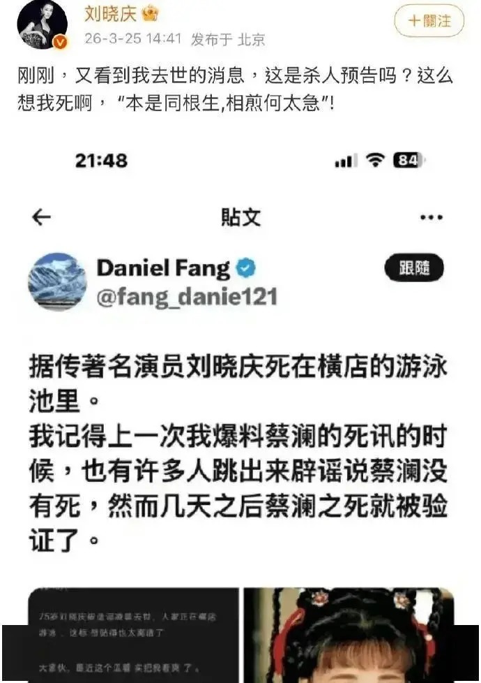 这事最近闹得挺大,75岁的刘晓庆公开说,自己被传死在横店游泳池,造谣的账号“Daniel Fang”背后,是她养了四十多年的外甥靖然。她不是随便说说,还贴了聊天记录截图,上面写着“14:56是我的外甥靖然”,还说“我查过他”。截图没打码,发出来时挺决绝的。